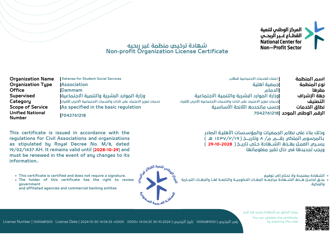 الجمعية معتمدة من قبل المركز الوطني لتنمية القطاع غير الربحي بترخيص رقم 1000681500